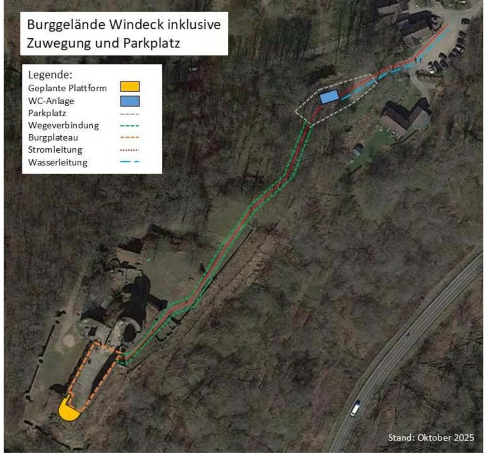 Zitat aus der Vorlage: „Der Rhein-Sieg-Kreis beabsichtigt auf der Burgruine Windeck und dem zugehörigen Parkplatzbereich die Errichtung und Ertüchtigung baulicher Anlagen im Zuge der Regionale 2025 vorzunehmen. Hierbei soll die bisherige Zuwegung barrierearm ertüchtigt und eine barrierearme Aussichtsplattform mit Mauerbrüstung am südlichen Ende des Burgplateaus geschaffen werden.
