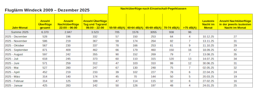 Seit Juli 2009 zeichnet eine Fluglärmmessstation den Fluglärm in Windeck rund um die Uhr auf. Die Messwerte dieser Fluglärmmessstation werden automatisiert an den Deutschen Fluglärmdienst (DFLD) übertragen und von dort aus im Internet zur Verfügung gestellt. Eine Auswertung der Messwerte über einen Zeitraum von 15,5 Jahren, von Juli 2009 bis Dezember 2025, weist auch eine Erhöhung der Nachtflüge zwischen 22:00 und 06:00 aus.