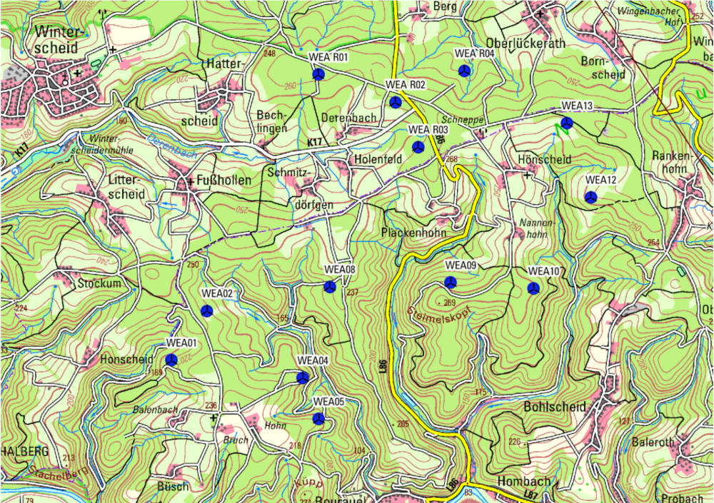 Es sollen 13 Windenergieanlagen gebaut werden. Und zwar in Eitorf-Merten, Eitorf-Halft, Ruppichteroth-Halft (Flurstück, Gemarkung), Ruppichteroth-Dehrenbach und Ruppichteroth-Velken.